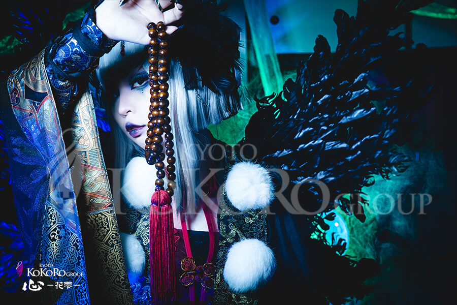 撮影アイテムの数珠、錫杖がミステリアスな雰囲気を醸し出しています。