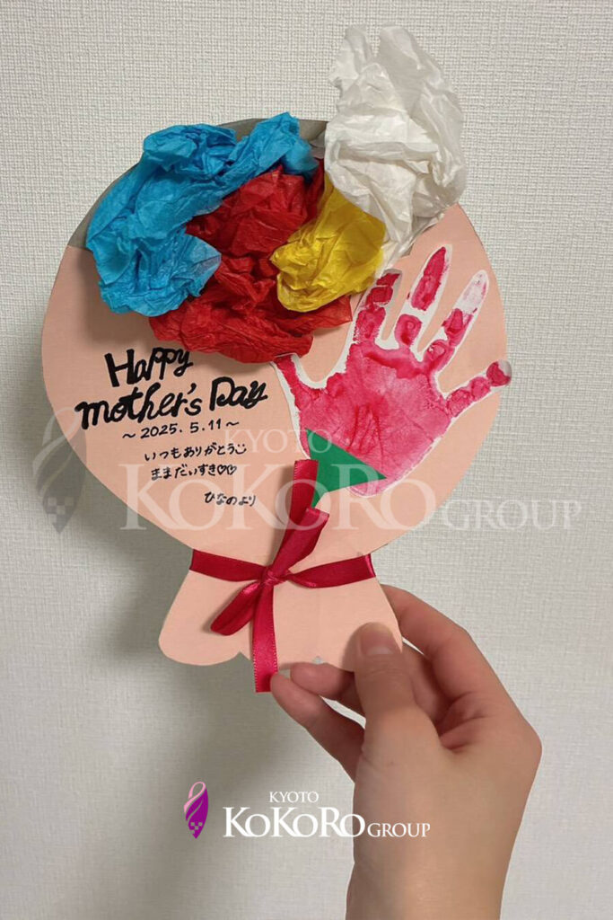 母の日の作品には、小さな手のひらで一生懸命押した手形と、「だいすき」の気持ちが伝わってくる色使い。