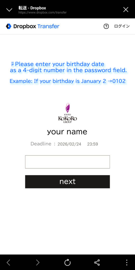 When you access the URL received by LINE or e-mail, a screen like 👇 is displayed.