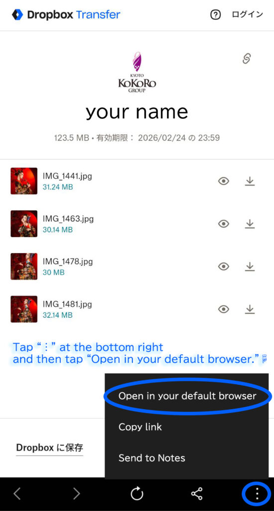 ①Tap “︙” at the bottom right and then tap “Open in your default browser.”